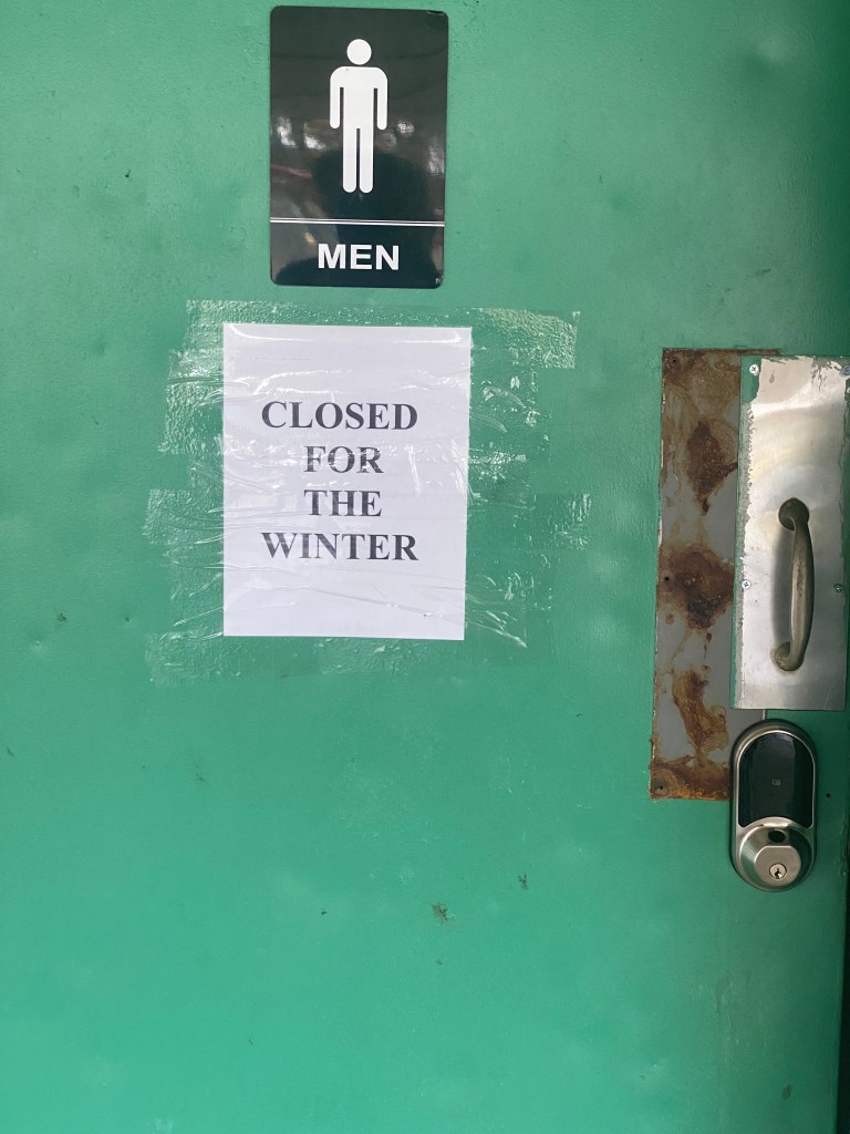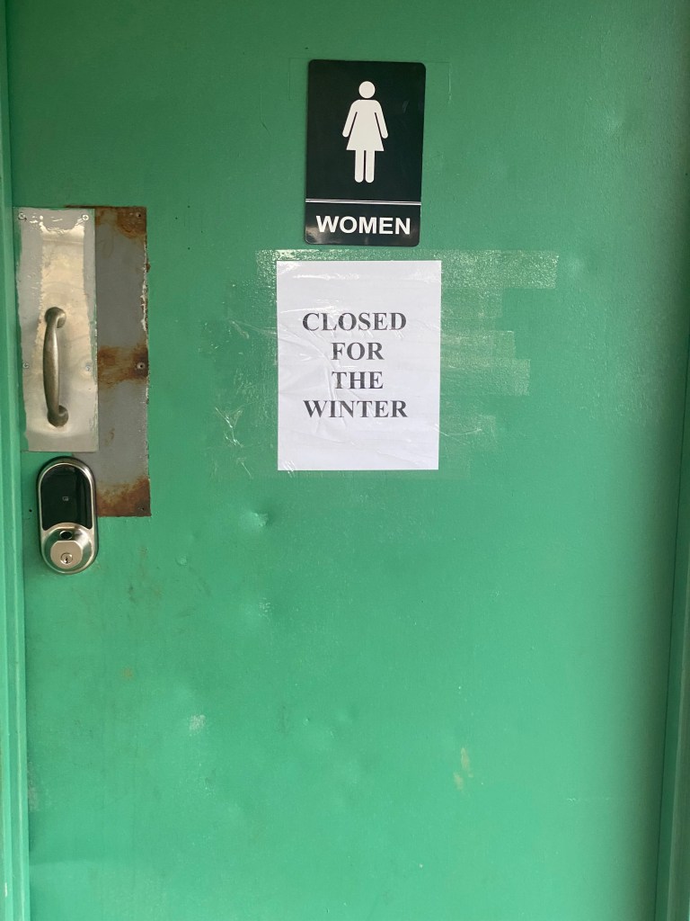 The Bathrooms are closed for the winter due to not having heat to keep them from freezing. Sorry for any inconvenience this may cause .